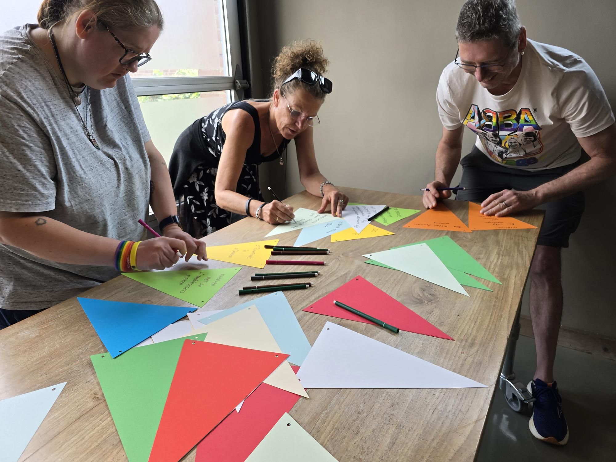 Natuurlijk een speels feestje vol met werkvormen. We hebben samen de slingers gemaakt én opgehangen met terugblikken op de mooiste momenten van 10 jaar.