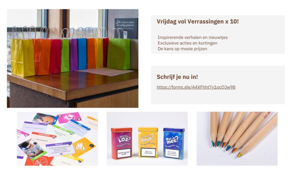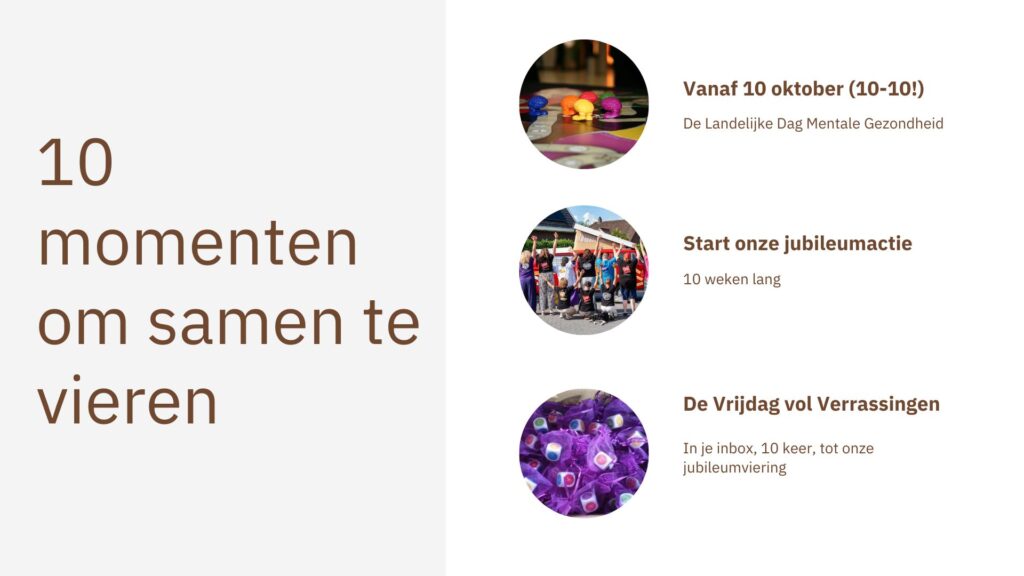 Vanaf 10 oktober, de Landelijke Dag van de Mentale Gezondheid, starten we onze jubileumactie: 10 weken lang elke vrijdag een Vrijdag vol Verrassingen in je mailbox.